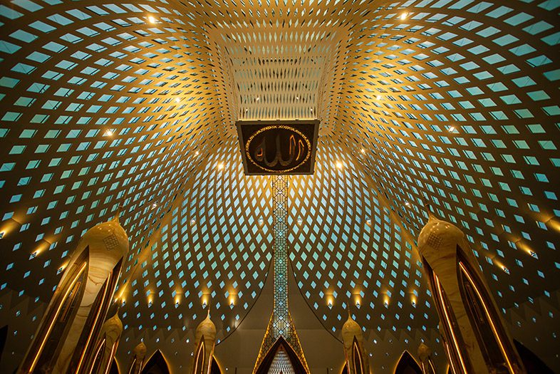 Cahaya alami difilter melalui panel kaca, menghasilkan suasana lembut yang berubah mengikuti waktu. Elemen kaligrafi diterapkan secara subtil dalam pola dinding dan plafon, bukan sekadar ornamen, melainkan bagian dari struktur geometris itu sendiri.