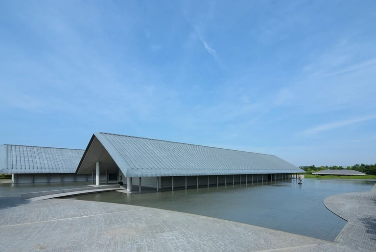 Kolam reflektif yang mengelilingi bangunan memperkuat hubungan antara arsitektur dan lanskap. Permukaan air menciptakan kesinambungan visual sekaligus menghadirkan pengalaman ruang yang berubah mengikuti cahaya dan waktu.